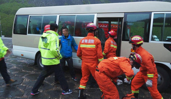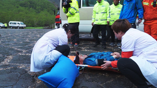 第二個場景,模擬山體崩塌,滾石砸中一輛運載20名乘客的中巴車車門,造成車門損壞無法開啟,1名游客因受到驚嚇心臟病發(fā)作。應(yīng)急預(yù)案啟動后,駕駛員立即使用對講機向上級報告,瀑布工作人員立即趕到車輛附近,協(xié)助駕駛員打開駕駛室車門,車內(nèi)游客迅速下車離開危險地帶。隨后,長白山消防支隊、景區(qū)醫(yī)護人員先后趕到現(xiàn)場,消防員們使用工具破門解救,醫(yī)護人員現(xiàn)場急救心臟病游客,隨后被長白山中心醫(yī)院120急救車送往醫(yī)院。與此同時,調(diào)度應(yīng)急救援隊將車輛推離危險區(qū)域;檢修車輛牽引事故車輛離開危險區(qū)域。