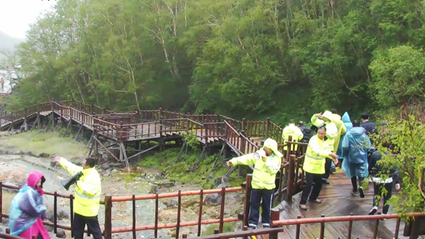 第三個場景模擬持續(xù)降雨,瀑布發(fā)生泥石流,由于天池、瀑布景點同時不具備開放條件,北景區(qū)關(guān)閉,啟動游客退票應(yīng)急預(yù)案:在二道白河區(qū)域發(fā)布景區(qū)封閉告知;協(xié)調(diào)公安交警部門在望云橋處對過往旅游車輛進行景點封閉提示;在以上告知程序啟動的同時,退票工作也有序進行。
