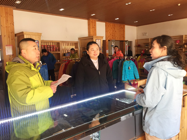 活動中支委班子成員及相關人員來到北景區(qū)人員密集場所,以匿名問卷調(diào)查形式,對景區(qū)內(nèi)是否存在,欺行霸市、欺客瞞客、不明碼標價、誘導消費、擾亂景區(qū)秩序現(xiàn)象,進行摸排。隨后來到景區(qū)各經(jīng)營網(wǎng)點走訪并就掃黑除惡斗爭的政策、內(nèi)容及舉報方式、舉報渠道,向經(jīng)營商戶進行講解,希望商戶們能以掃黑除惡專項活動為契機,為維護長白山旅游品牌形象,打造一個優(yōu)質(zhì)的營商環(huán)境共同努力。